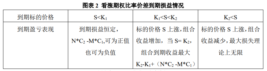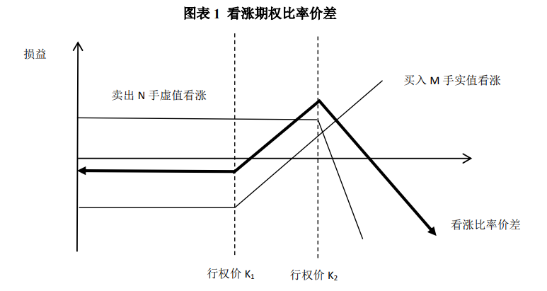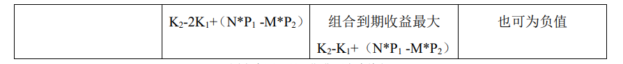 其中,K1、K2分别为期权合约行权价,K1<K2;S 为标的市场价格,C1、C2分别为行权价 K1、K2的看涨期权权利金,P1、P2 分别为行权价 K1、K2的看跌期权权利金。M、N 分别为期权合约的数量,M<N。