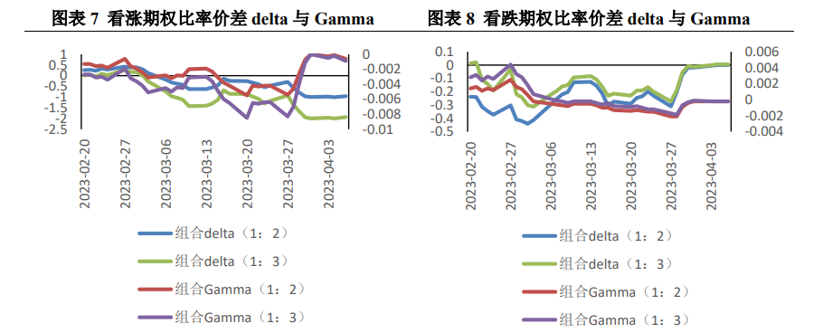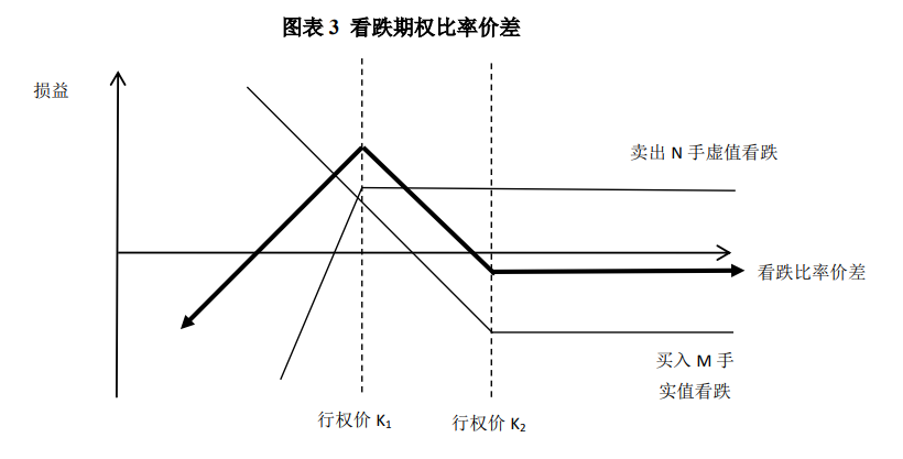 投资者会采用比率价差的形式实现仓位的 delta 中性,当期权标的处在单边上涨行情中,采用看涨比率价差实现中性的对冲成本高,且在强势的跳空高开行情中,因对冲不及时易造成看涨期权义务仓的风险敞口暴露;在强势行情中,用卖出虚值看跌加上买入实值看跌来实现 delta中性,这样做对冲成本及对冲频率低,即使遇到强势大涨行情,整体仓位风险敞口不大。反之,在弱势单边下跌行情中,采用看跌比率价差实现中性的成本也很高,采用看涨期权比率价差组合更适宜。