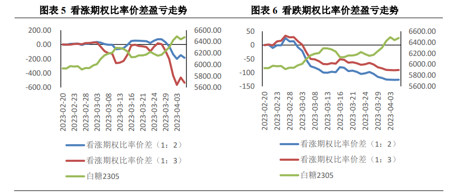 2023 年上半年,白糖走出了单边上涨行情,本文选用行权价 5800 与 6100 的 05 合约进行实盘验证。下文的看涨比率价差为买入 1 手实值看涨期权再卖出 2 手或者 3 手虚值看涨期权;看跌比率价差为买入 1 手实值看跌期权再卖出 2 手或者 3 手虚值看跌期权。