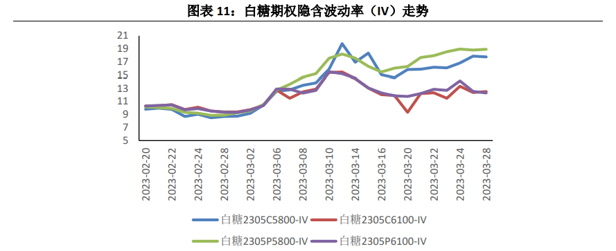 看跌期权比率价差在中途收敛且随后高于 0 值,原因是随着标的连续上涨,建仓时的卖出的虚值看跌期权变为深度看跌期权,vega 趋于 0,建仓时买入的实值看跌期权变为浅度虚值,vega大于 0。期间白糖期权合约隐含波动率(IV)持续上升,特别是为看涨比率价差带来较大的升波风险。
