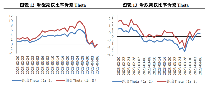 从波动率风险敞口来看,由于在比率价差中,买入期权的数量少于卖出期权的数量,隐波的负相关风险更大,在实盘数据中,建仓初期,各个组合的 vega 均为负值,其中,看涨期权比率价差的组合 vega 值从-6.9273(1:2 组合)、-13.7848(1:3 组合)变为到期时的-0.2392(1:2 组合、-0.3588(1:3 组合);看跌期权比率价差的组合 vega 值从-6.7207(1:2 组合)、-13.5959(1:3 组合)变为到期时的-0.0683(1:2 组合、-0.1634(1:3 组合),Vega 值负值随着时间推移整体趋于 0。对比两种比率价差组合,看涨期权比率价差保持负 vega 的时间周期更长,而